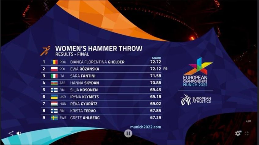 Mai sus de atât nu se poate! Bianca Ghelber flutură tricolorul românesc, sărbătorind titlul de campioană europeană la aruncarea ciocanului. E prima medalie de aur pe care România o cucerește în atletism, la nivel de seniori, din 2002 încoace. Destinul a făcut ca la 20 de la reușita muncheneză a Ionelei Târlea în proba de 400 m garduri, Bianca Ghelber să triumfe tot aici, în capitala Bavariei, cu o aruncare ce a măsurat 72,72 metri. Atleta SCM Bacău își ține cu greul lacrimile în această seară fără de sfârșit de 17 spre 18 august 2022. Plânge, în schimb, în voie, fiica sa de șapte ani- i-a sărbătorit pe 31 iulie- Victoria. Victoria plânge, dar e fericită: „Ești cea mai bună, mami! Cea mai bună!”. Și „mami” chiar că e cea mai bună. Mai bună cu 60 de centimetri față de performanța vice-campioanei europene, poloneza Ewa Rozanska. Mai bună cu peste un metru decât medaliata cu bronz, italianca Sara Fantini și cu aprope doi decât azera Skydan, cea care, după acel 74,57 din calificări, s-a oprit în finala de miercuri la numai 70.88.