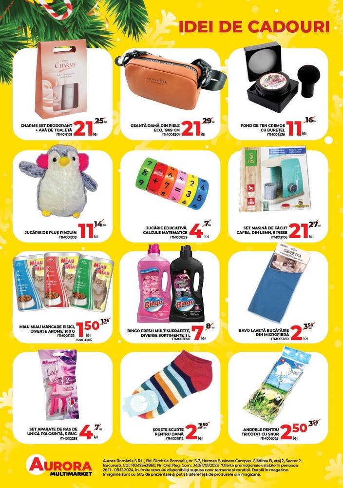În această perioadă festivă, magazinul nostru este pregătit să te întâmpine cu decorațiuni de Crăciun, seturi cadou ideale pentru cei dragi și o selecție variată de jucării, perfecte pentru cadourile de Moș Nicolae. Fie că ești în căutarea unor globuri elegante, instalații luminoase, coroane festive sau alte decorațiuni de sezon, le vei găsi pe toate la prețuri excelente.