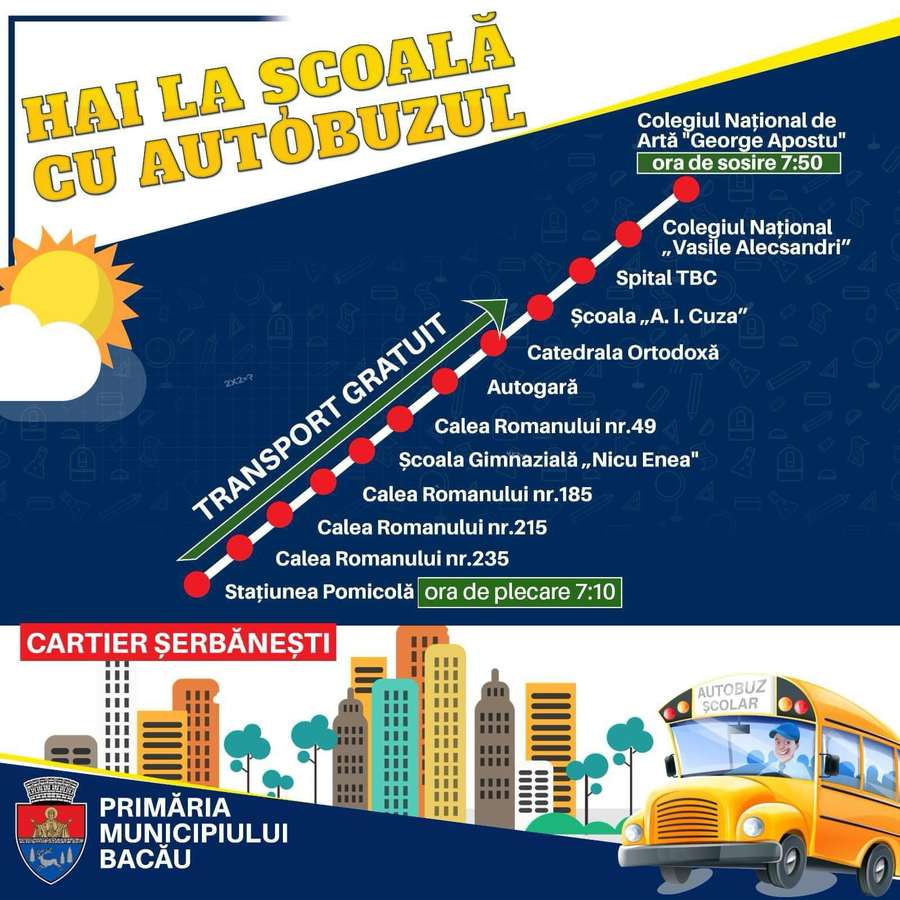 Primarul municipiului Bacău, Lucian Daniel Stanciu Viziteu, a anunțat reluarea autobuzelor școlare începând de luni, 9 septembrie. Odată cu reînceperea cursurilor, elevii vor beneficia din nou de transport gratuit pe traseele special destinate, care acoperă zonele Gherăiești, Șerbănești și Izvoare.
