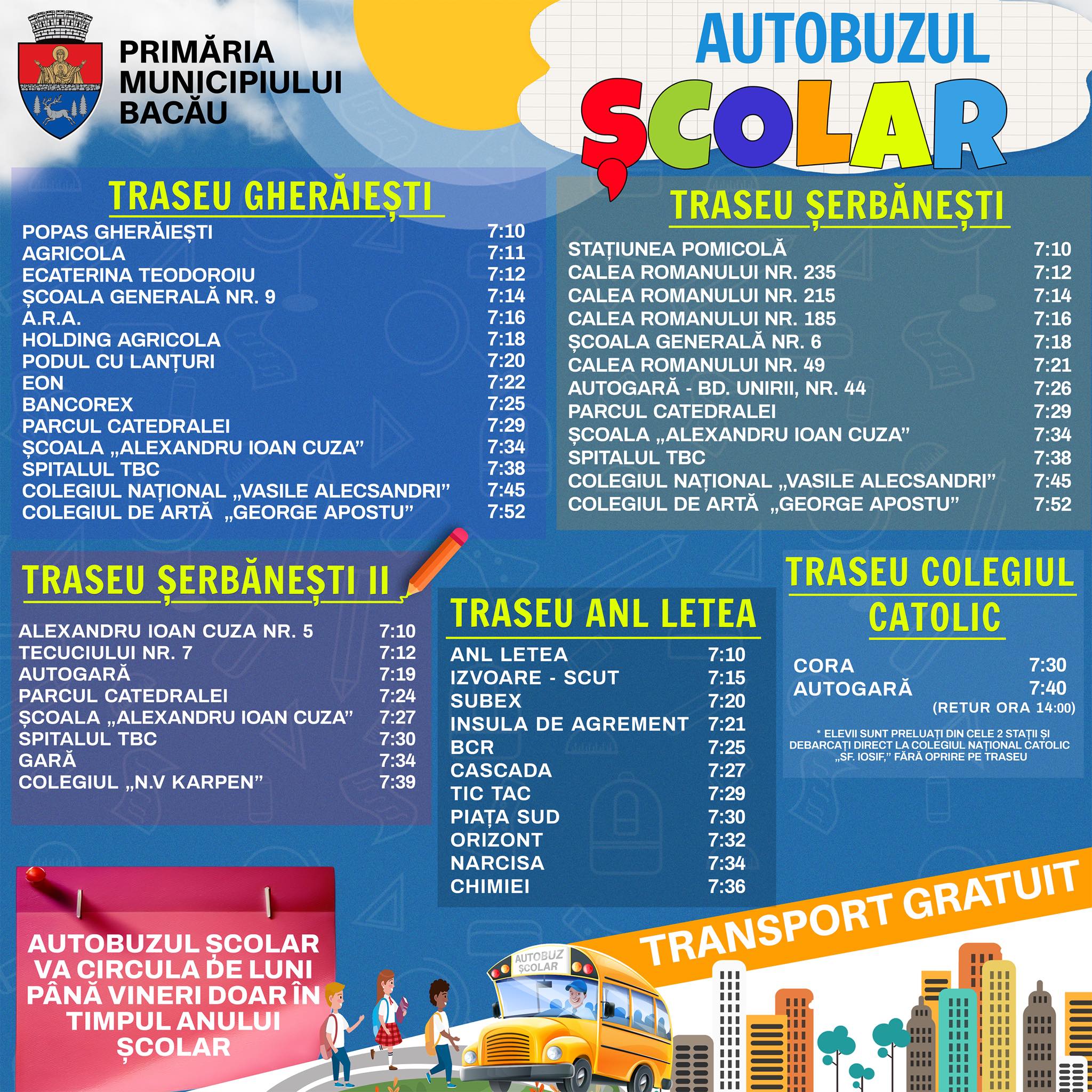 Primarul municipiului Bacău, Lucian-Daniel Stanciu-Viziteu, a anunțat reluarea programului autobuzelor școlare începând de luni, 8 septembrie. Serviciul va funcționa de luni până vineri, dimineața, pe cele trei trasee dedicate din Gherăiești, ANL Letea și Șerbănești, cu plecare la ora 07:10 din stațiile de pornire.