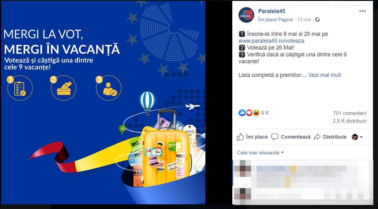 Astfel, s-a constatat că SC PARALELA 45 TURISM SRL a organizat Loteria Publicitară “Mergi la vot, mergi în vacanță”, acțiune ce se desfășoară în perioada 08.05.2019 – 27.05.2019, sub sigla PARALELA 45, având ca grup țintă persoanele fizice cu vârsta minimă de 18 ani și condiție obligatorie de înscriere – să voteze la alegerile europarlamentare.