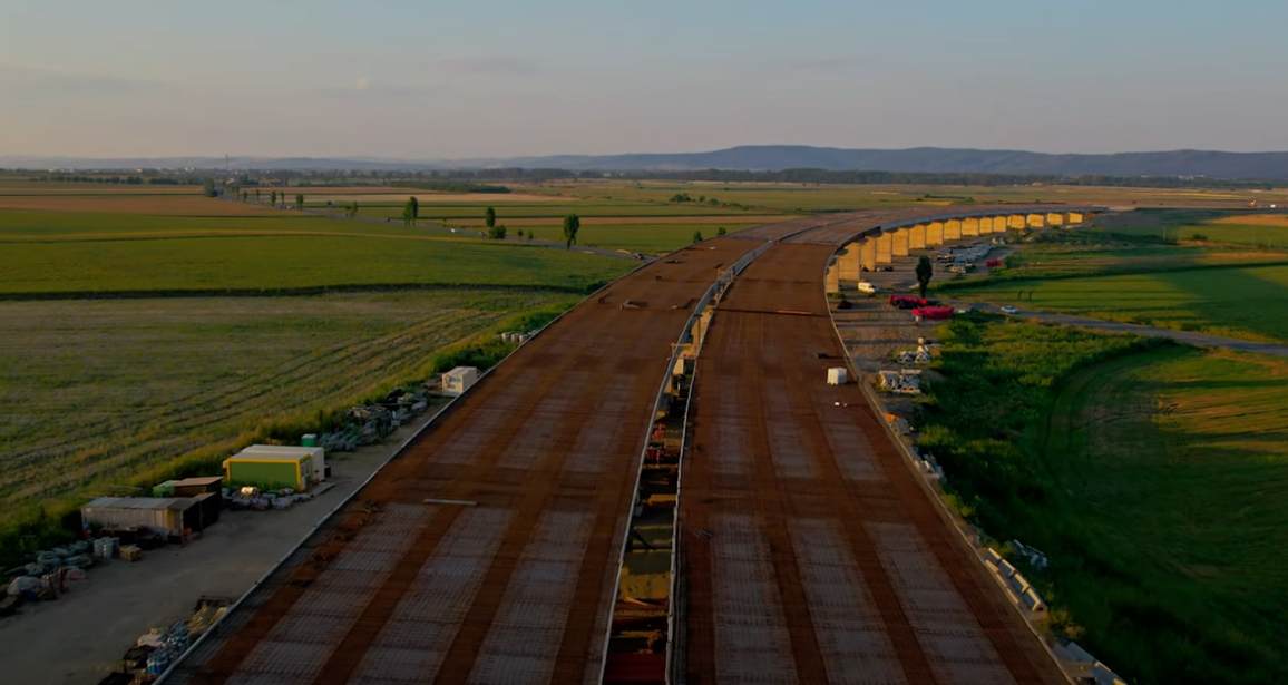 Filmare spectaculoasă cu drona surprinde lucrările la Autostrada Moldovei A7 în zona Domnești, unde se ridică pasajul peste DN2 E85 și magistrala de cale ferată, pe traseul Focșani–Bacău.