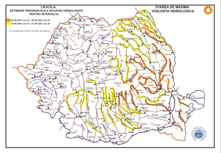 În intervalul 18.06.2021, ora 16:00 – 20.06.2021, ora 24:00 pe râurile din bazinele hidrografice:
