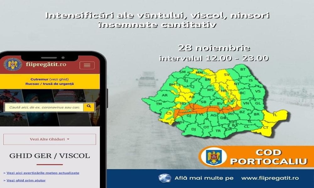 În intervalul 28 noiembrie, ora 12:00 – 28 noiembrie, ora 23:00, în Carpații Meridionali și de Curbură, la altitudini de peste 1700 m, se prognozează intensificări susținute ale vântului cu rafale de 90…110 km/h, ninsori abundente și viscol, cu vizibilitate redusă sub 50 m. Aceste condiții meteorologice pot impune riscuri semnificative pentru traficul rutier și pentru cei care se află în zona montană.