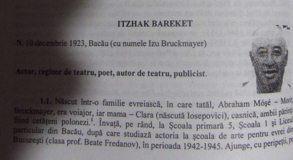 Se numeşte Itzhak Bareket (alias Izu Bruckmayer), născut în Bacău la 10 decembrie 1923, din cetăţeni polonezi, după cum îi mărturiseşte lui Cornel Galben în 1999. A fost actor, regizor de teatru (a urmat clasa lui Beate Fredanov), poet, dramaturg şi publicist. Bună parte din viaţă o petrece pentru/pe scenă, jucând (a fost Ghiţă Pristanda în „O scrisoare pierdută”, la Teatrul Municipal din Haifa) ori scriind piese de teatru, ca „Peste două săptămâni la Kineret” (1967).