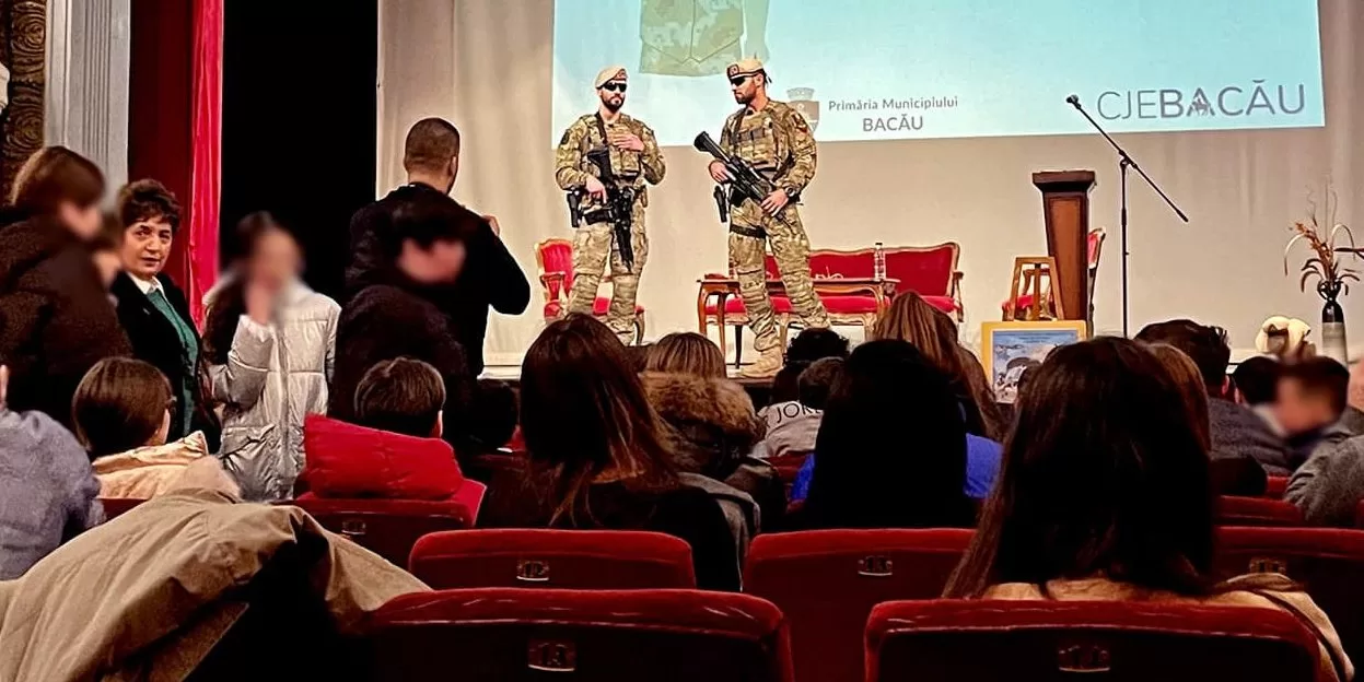 Dezbaterea organizată de municipalitatea băcăuană pe tema violenței din școli, de la Teatrul Bacovia, a beneficiat de prezența unor militari cu arme automate.