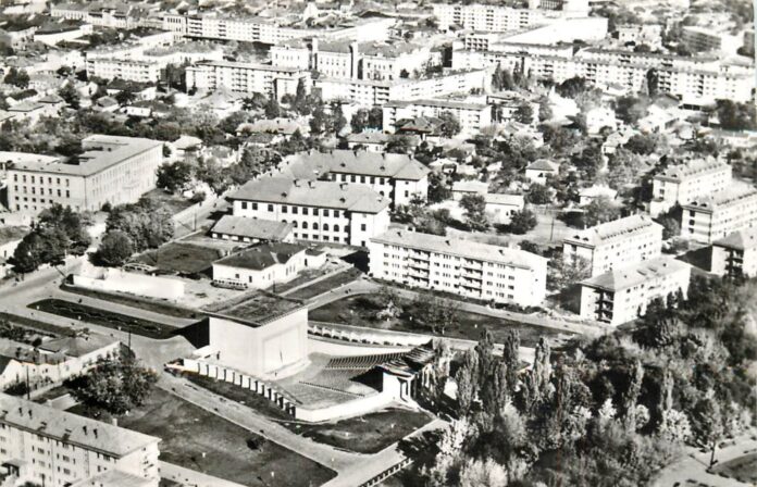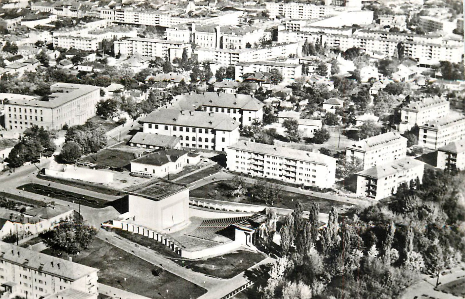 Imaginea surprinde o vedere aeriană din anii ’60 a orașului Bacău, concentrându-se asupra zonei unde se găsește Teatrul de Vară.