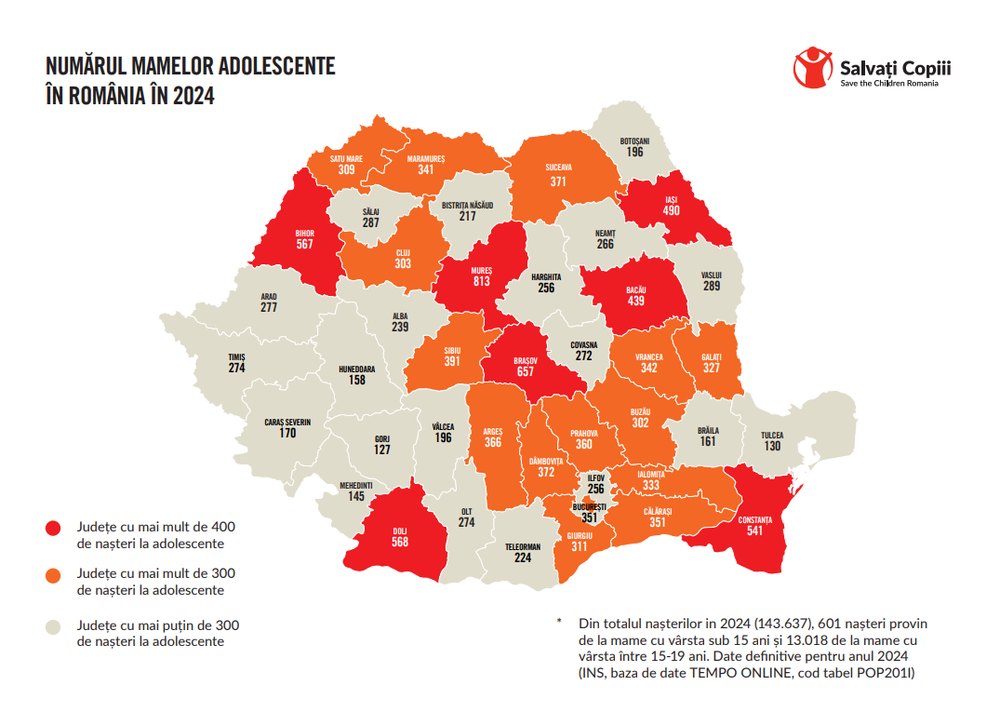 La nivel național, din totalul de 143.637 de nașteri înregistrate anul trecut, 13.018 provin de la mame cu vârste între 15 și 19 ani – aproape una din 10 nașteri. În 601 cazuri este vorba despre mame sub 15 ani. Situația este cu atât mai gravă cu cât 23 dintre aceste fete au devenit mame pentru a doua oară, iar o adolescentă sub 15 ani a adus pe lume al treilea copil. Alte 652 de fete care nu împliniseră 19 ani se aflau deja la a treia naștere.