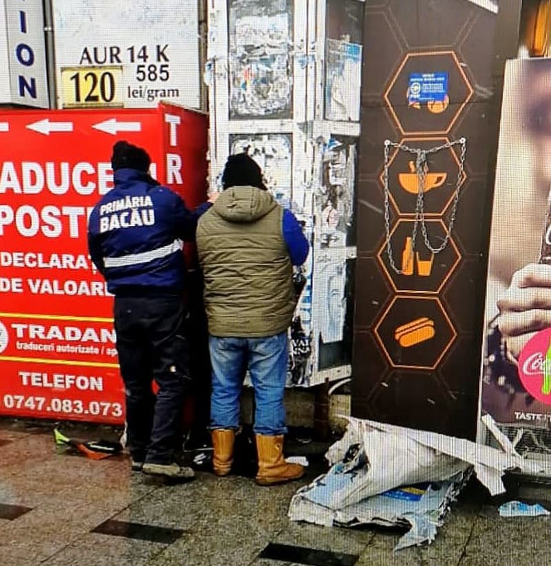 Lucrătorii de la salubrizare au început campania de curățare a clădirilor de pe domeniul public de afișele lipite de-a lungul anilor, anunță Primăria Bacău. Se atrage atenția tuturor, că lipitul de afișe în locuri neamenajate este interzis și se sancționează contravențional de către Poliția Locală Bacău, cu sume de până la 2.500 de lei.
