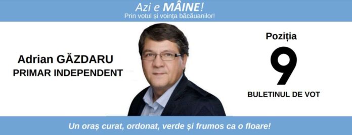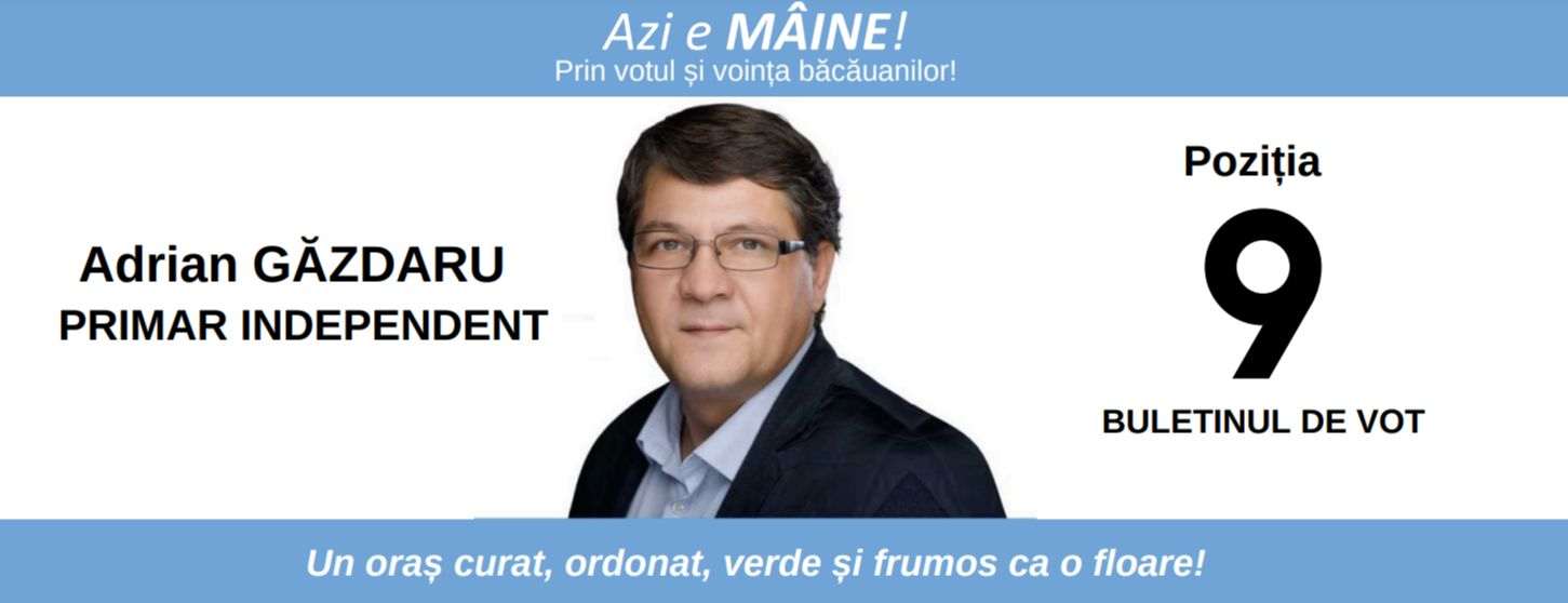 În calitate de candidat independent la Primăria Bacău, neaservit niciunui interes politic, vă invit pe 9 iunie, să puneți ștampila pe poziția 9, de pe buletinul de vot, cu credința că putem construi împreună un Bacău de care să fim mândri, din punct de vedere urbanistic, cultural, social, economic!