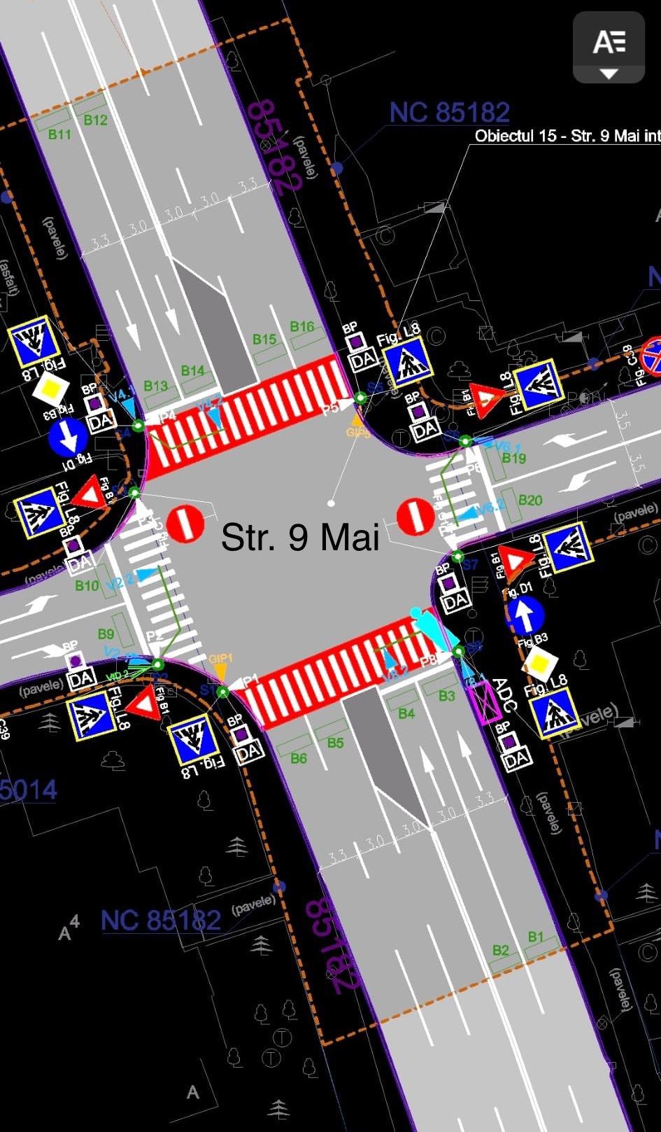 Tot din această seară începe marcarea tuturor intersecțiilor finalizate în cadrul proiectului SMT, începând cu zona 9 Mai. După finalizarea marcajelor pe Strada 9 Mai, vor fi puse în funcțiune noile semafoare pentru fluidizarea traficului.