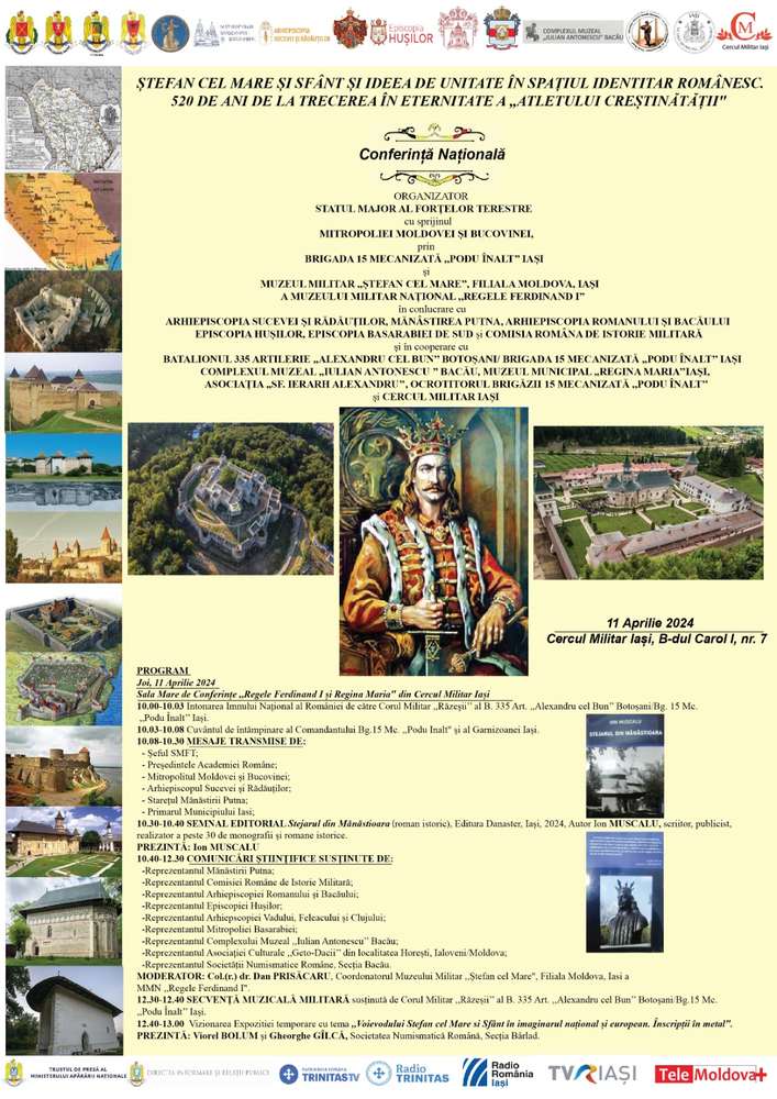 Reprezentanții Complexului Muzeal „Iulian Antonescu” și Secției Bacău a Societății Numismatice Române – al cărei președinte este profesorul, istoricul, arhivistul și medalistul Vilică Munteanu, vor susține comunicări științifice la conferința „Ștefan cel Mare și Sfânt și ideea de unitate în spațiul identitar românesc. 520 de ani de la trecerea în Eternitate a «Atletului Creștinătății»”, care are loc joi, 11 aprilie, la Cercul Militar din Iași.