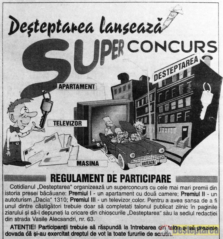 Câțiva ani mai târziu, cititorii cotidianului nostru aveau în față o nouă provocare. Cu prețul unui ziar puteai deveni câștigătorul unui televizor color, al unui autoturism sau al unui apartament cu două camere. Tentante erau și sejururile de câte 7 zile pentru două persoane, la Slănic Moldova, Poiana Brașov și în Grecia. Luni, 12 iunie 200o, reporter Dan Vrânceanu: „Superconcursul Deșteptarea și concursul «Votul tău contează» organizat de PDSR Bacău și-au desemnat, ieri după-amiază, în transmisiune directă din studioul Euro TV, fericiții câștigători. Extragerea taloanelor câștigătoare s-a efectuat în prezența primarului municipiului Bacău, Dumitru Sechelariu, care a fost însoțit de soția sa, Laudeta, și cei doi copii, Ema și Doru Sirius, a directorului general al SC Deșteptarea SA, Tudorel Ion, care s-a aflat în studioul Euro TV împreună cu fiul său Ștefănuț, a directorului campaniei PDSR pentru municipiul Bacău și ales, recent, consilier local, Dragoș Benea, și, nu în ultimul rând, a redactorului șef al cotidianului Deșteptarea, Dorin Ciulină. Mezinii familiilor Sechelariu și Tudorel au extras din sutele de mii de taloane pe cele ale fericiților câștigători. De excursia în Grecia, premiu oferit de PDSR, a beneficiat Virginia Țampău din Bacău. Nicolae Simion-Doba, pensionar din Bacău este fericitul posesor al televizorului color. Premiul doi, autoturism Dacia 1310, care a fost expus, timp de câteva săptămâni în fața Hotelului Decebal, a revenit Cristinei Elena Huiban din Bacău. Doamna Cristina, cu opt ani de căsnicie la activ, nu are permis de conducere. Marele premiu, un apartament de două camere a revenit unei băcăuance de numai 23 de ani, fără ocupație, orfană, pe nume Claudia Sumănaru.”