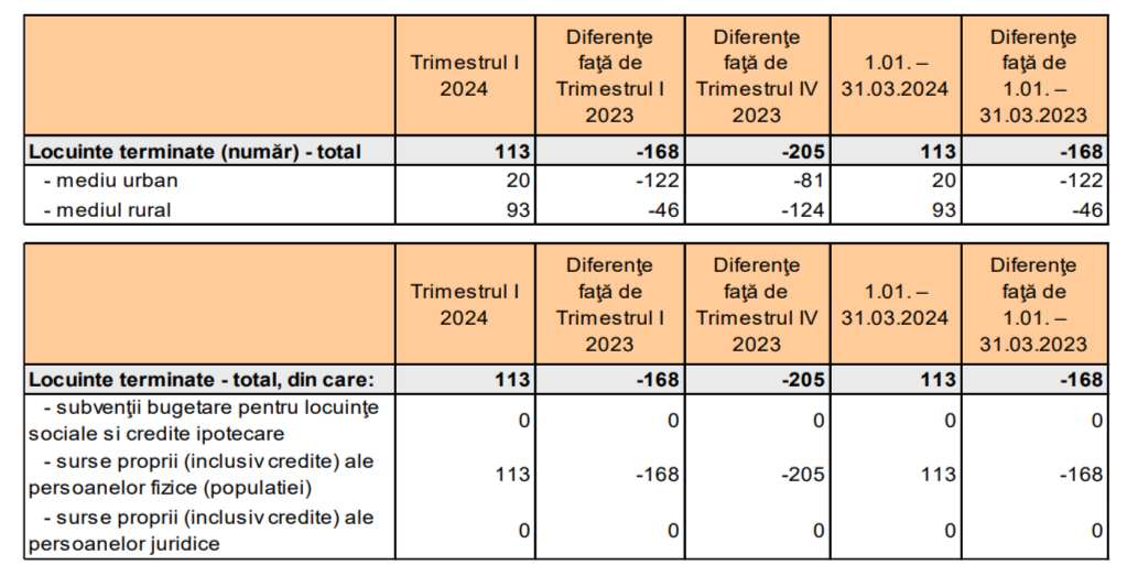 Contrar trendului pozitiv observat în numărul de autorizații eliberate, numărul locuințelor finalizate și date în folosință în primele trei luni ale anului 2024 a scăzut cu 168 față de perioada corespunzătoare din 2023. În total, au fost terminate 113 locuințe, toate executate în regie proprie din surse ale populației. În prezent, în județ sunt în curs de execuție 2.989 locuințe, dintre care doar 12 sunt finanțate din alte fonduri decât cele ale populației.