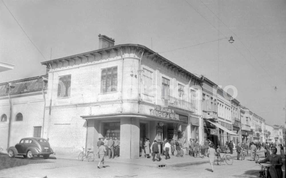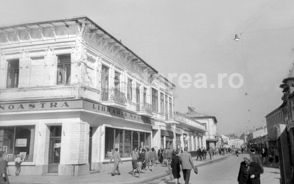 „Măi, Nelule! Nu era zi să nu trec pe acolo. Eram tânăr. Lucram la imprimeria din spatele Prefecturii. După ce s-a desființat, am lucrat la tipografia de pe strada Gutenberg. Se intra acolo printr-un gang, mai sus de Teatru, după Magazinul Universal Bacăul. Cam pe unde s-a construit cinematograful Central. Ce cărți vechi erau acolo! Nu-mi permiteam să cumpăr decât rar. Mă uitam cum erau culese, cum erau legate. Câtă migală și măiestrie. Îmbrăcate în piele, cu filigran. Adevărată artă pentru că toate erau unicate. Mă doare sufletul și acuma când îmi amintesc. S-a întâmplat că am rămas fără bani, soția era internată și a trebuit să vând și eu câteva. Nu le-am recuperat niciodată.” Pe aceeași parte, același corp unitar de clădiri mai cuprindea o cofetărie și un magazin de mezeluri. Urma Restaurantul „Macul Roșu”, care s-a transformat apoi în autoservire, cu specific „lacto vegetarian”.