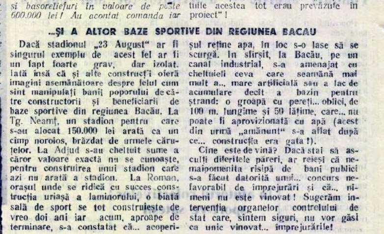 «În regiunea Bacău, numărul construcțiilor sportive este destul de important, iar pe alocuri sunt fapte și exemple care ar putea servi ca bun exemplu. Nu ne vom ocupa însă de ele, pentru că am întâlnit în cursul raidului nostru o serie de aspecte deosebită gravitate, care trebuie neapărat prezentate ca un exemplu de ceea ce nu trebuie să se construiască. Povestea stadionului „23 August” din Bacău începe acum câțiva ani, când, pe plan local, s-a pornit construirea unui teren de fotbal.