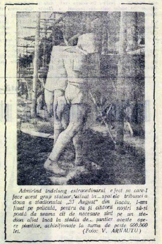 Privind isprăvile de până acum te întrebi: cum a putut fostul comitet regional C.F.S. să angajeze ca diriginte de lucrare un nepriceput în materie ca ing. Enășoaie, de la care pornesc multe din necazurile de azi? Cum s-au putut reuni atâtea neglijențe grave – sesizate la timp și de ziarul nostru – încât să se ajungă la actuala situație? Iar ca o „încoronare” demnă de asemenea treabă, ingenioșii constructori de baze sportive din Bacău au luat o hotărâre de-a dreptul uluitoare. Temându-se să nu piardă, la sfârșitul lui 1956 un rest de bani rămas necheltuit, au comandat o serie de statui și bazoreliefuri în valoare de peste 600.000 lei.