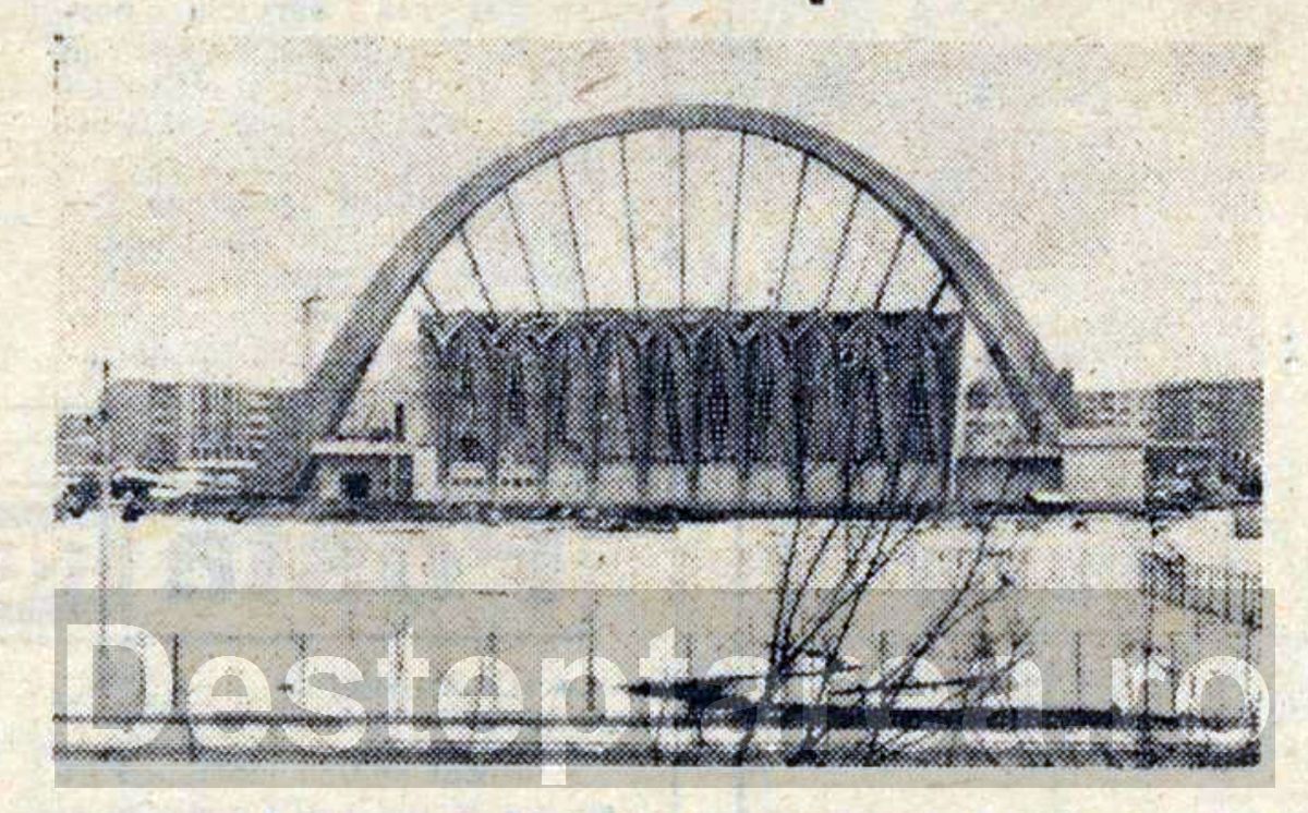 Edificiul sportiv — mai mult decât oricare altul — oferă arhitectului posibilități largi : masă, întindere ln spațiu, dimensiuni mari, o generoasă invitație la risipă de fantezie creatoare… și toate acestea, împreună, vor releva puternic noua construcție în cadrul urbanistic al peisajului. Noua sală a sporturilor din municipiul Bacău magnetizează privirile încă de departe și arcul său dublu parabolic — unicat între construcțiile de acest gen — poate fi zărit de sus, de la Motelul .,Măgura”, sau de pe nu mai puțin zvelta pasarelă, ca și din oricare alt punct al urbei. Pașii ne-au purtat, pe nesimțite, mai aproape, tot mai aproape, pină ne-am trezit intrînd în noul edificiu care domină, prin siluetă, întregul complex sportiv „23 August”.