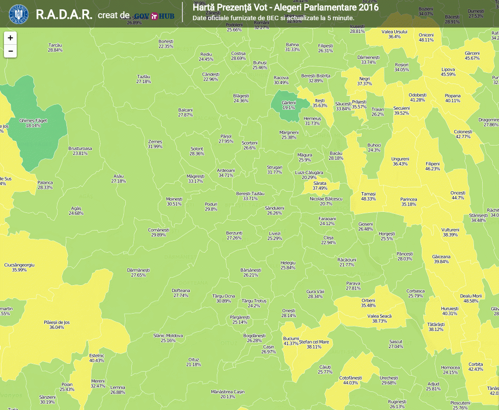 Cele mai slabe prezente la vot in judet se inregistreaza in comunele Garleni – 19,1 % si Ghimes-Faget – 18,14% (ora 16.27).