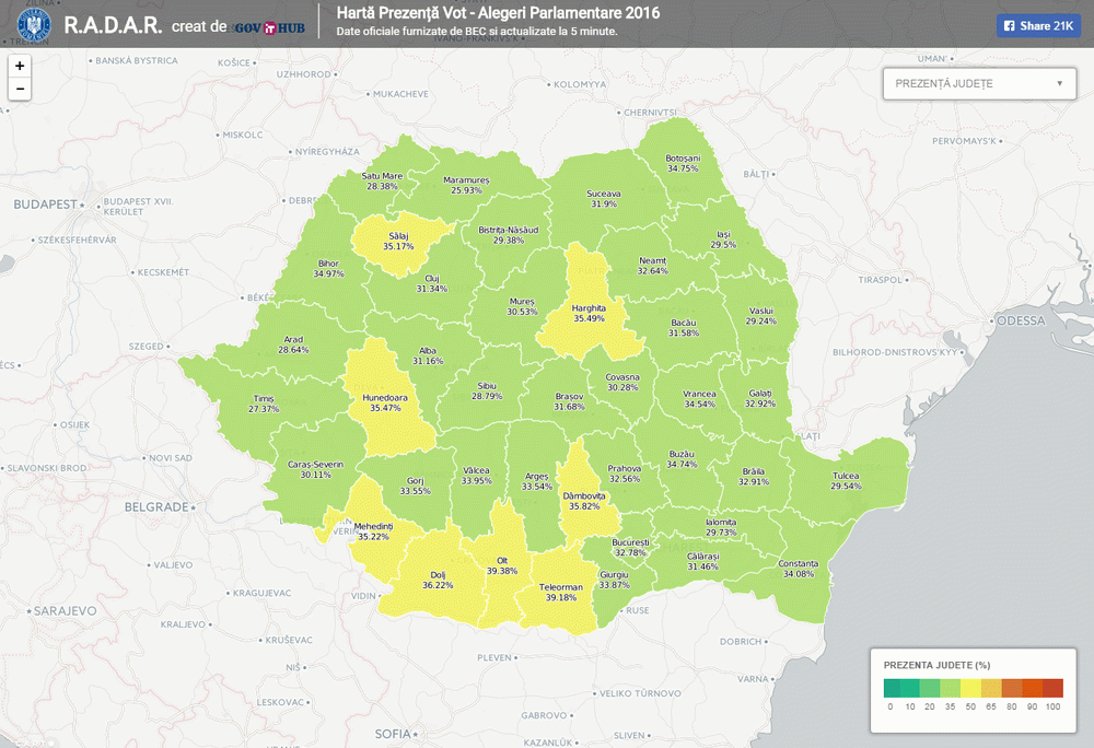 Prezenta la vot in judetul Bacau a fost, la ora 18.00, de 32,81%, mai mica decat media pe tara care a fost 34.39%.