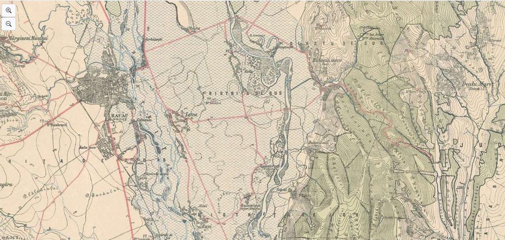• În dreapta imaginii se disting dealurile împădurite ale Pietricicăi și Caprei, delimitate de curbele de nivel desenate cu migală.