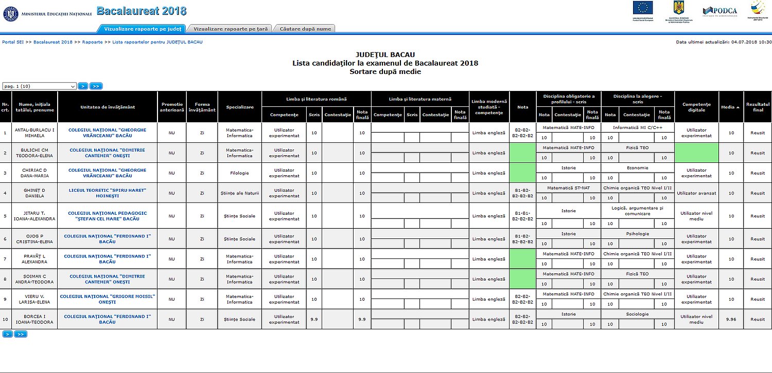 După numărul notelor de 10 (zece) pe linie, Bacăul se situează pe locul II, cu 9 astfel de medii, după București, care înregistrează 17 medii de 10.