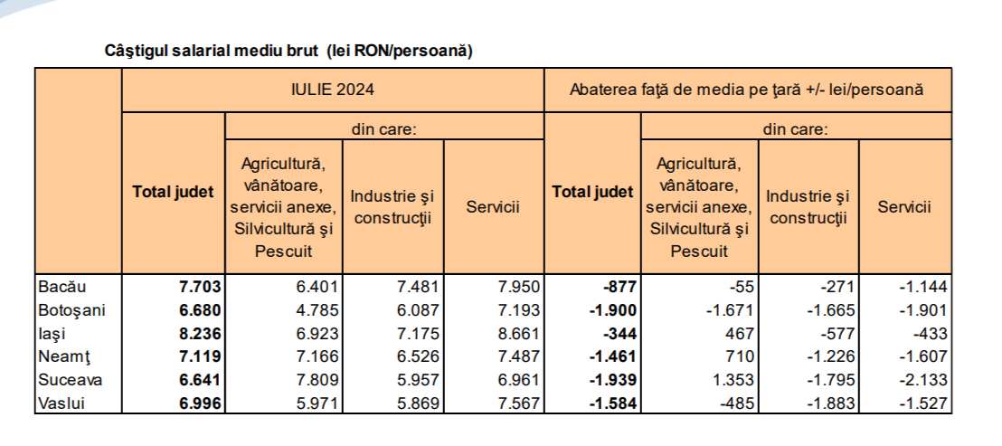 - Comparativ cu alte județe, Bacăul are un salariu peste Suceava (4.785 lei) și Vaslui (5.971 lei), dar sub Iași (6.923 lei).