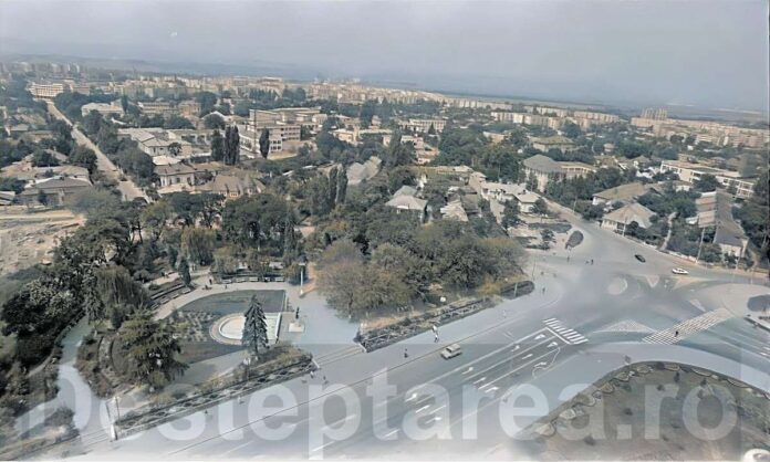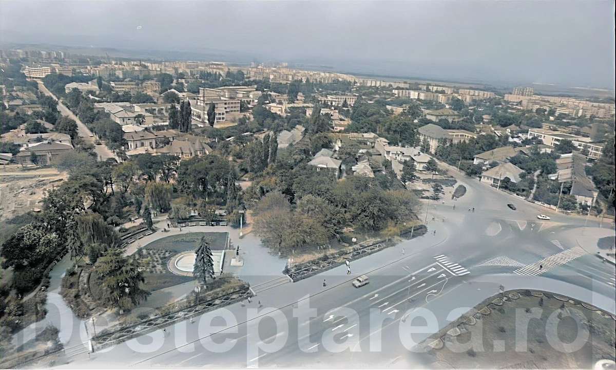 Fotografia colorizată surprinsă în centrul Bacăului la începutul anilor ’80 oferă o privire fascinantă asupra unui oraș în plină dezvoltare, într-un moment în care unele dintre clădirile și simbolurile sale emblematice încă nu erau ridicate. Imaginea arată o organizare urbană mai modestă, cu mai puține clădiri înalte și un spațiu verde generos în zona centrală.