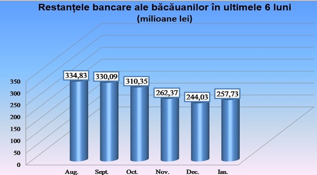 Restantele bancare ale bacauanilor au crescut din nou, in prima luna a anului 2016, dupa de in decembrie au atins, in scadere continua, nivelul lunii mai 2010, cel mai scazut nivel dupa recordul în crestere atins în septembrie 2013, când ajunsesera la peste 579 de milioane de lei.