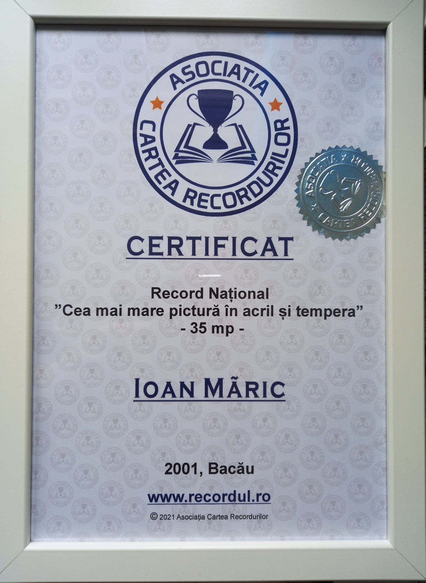 Deja se ştie: de câteva zile, „Chagall de Bacău” (cum găsim în „Jurnalul naţional” din decembrie 2007, sub semnătura ziariştilor Simona Lazăr şi Tudor Cireş) cunoaşte cea mai râvnită poziţie mondială. „Nașterea lui Hristos”, o lucrare monumentală (10 x 3,5 m), pe pânză prelucrată după modelul maeștrilor genului, în tempera și acril, a intrat în Guiness World Records. Iniţial a fost expusă la sfârșitul anului 2001 ca fundal de scenă într-un spectacol pregătit în cinstea Nașterii Maicii Domnului.