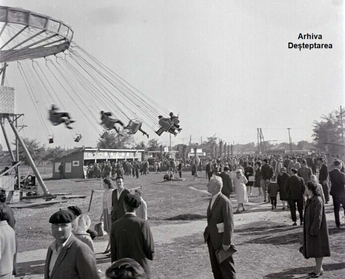 Privind fotografia, parcă auzi larma roții mari care se învârte în colțul stâng, cu leagănele ei zburând prin aer ca niște păsări de lemn, purtând râsetele copiilor și curajul tinerilor amorezați. În față, oamenii pășesc în hainele lor de sărbătoare – costume închise la culoare, pălării rotunde, baticuri legate sub bărbie. Se uită în jur cu uimire și poftă de viață, ca și cum fiecare moment trebuie păstrat cu grijă în suflet.