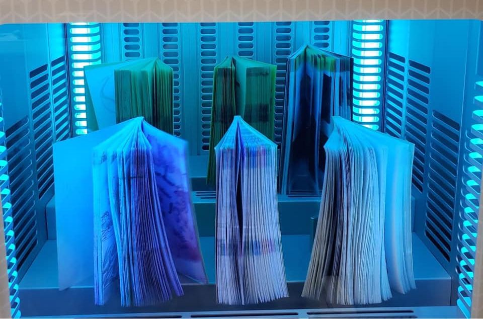 Camera de sterilizare este prevăzută cu 10 lămpi UV-C, 6 dispozitive de fixare a cărților și 3 filtre electrostatice de praf.