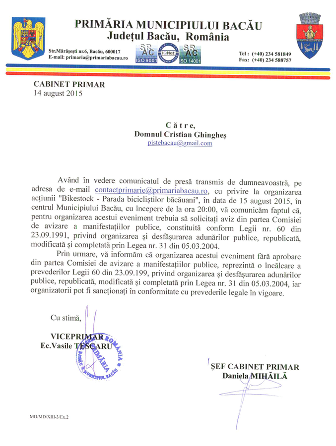 Cristian Ghinges, organizatorul a ceea ce a numit a fi o „plimbare cu bicicleta” spune ca a primit o adresa oficiala semnata de viceprimarul Vasile Tescaru in care i s-a pus in vedere faptul ca daca va organiza acest eveniment fara aprobarea municipalitatii, va incalca legea 60/1999 cu privire la adunarile publice si va risca o amenda.