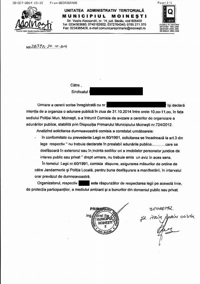 Cu toate acestea, legea respectiva precizeaza faptul ca „nu trebuie declarate manifestarile care se desfasoara in exteriorul sau in incinta sediilor ori a imobilelor persoanelor juridice de interes public sau privat”. Prevederea a fost citata, anul trecut, intr-un raspuns oficial al Primariei Moinesti catre solicitantii unei aprobari pentru organizarea unei manifestatii de protest in fata politiei din localitate. Primaria le-a raspuns, atunci, ca nu au nevoie de aprobare pentru a protesta.