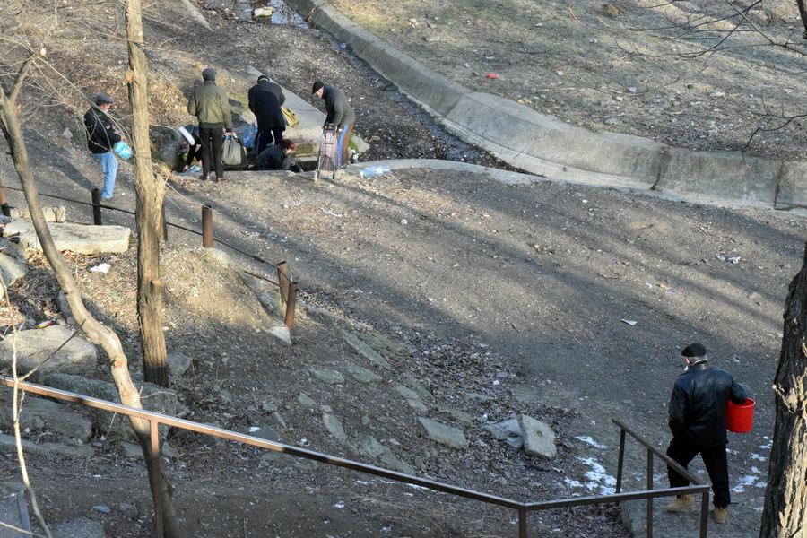 Era trecut de ora 11.00 și rezervorul din pasajul dintre Primărie și Palatul Administrativ era…uscat. „Nici n-au pus apă”, spune cu năduf un cetățean. Bidoanele goale erau aliniate, la rând, ca pe vremea lui Ceașcă, atunci când stăteai la coadă la lapte de la ora 3 dimineață. Un alt băcăuan aruncă niște înjurături printre dinți, își ia bidonul și pleacă spunând: „Își bat joc de noi. De o oră stau aici.” Un alt cetățean venea agale cu un bidon în mână.
