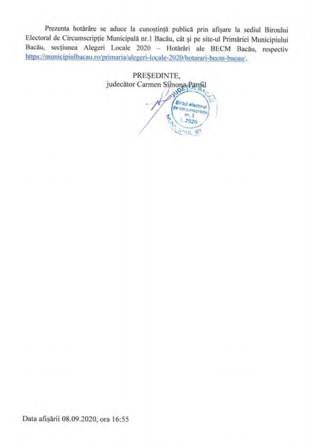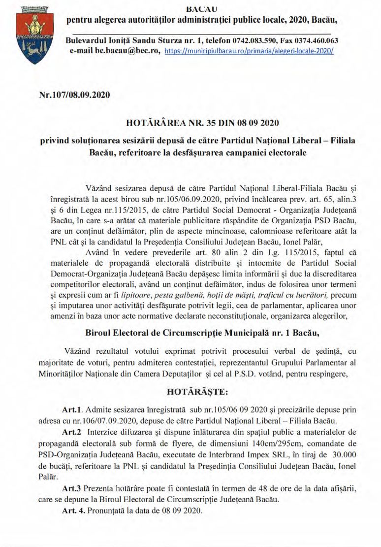 În motivarea deciziei, Biroul Electoral Municipal a luat în calcul faptul că materialele distribuite de PSD Bacău depășesc limita informării și sunt calomnioase la adresa lui Ionel Palăr, președintele PNL Bacău și candidatul Alianței PNL – USR-PLUS.