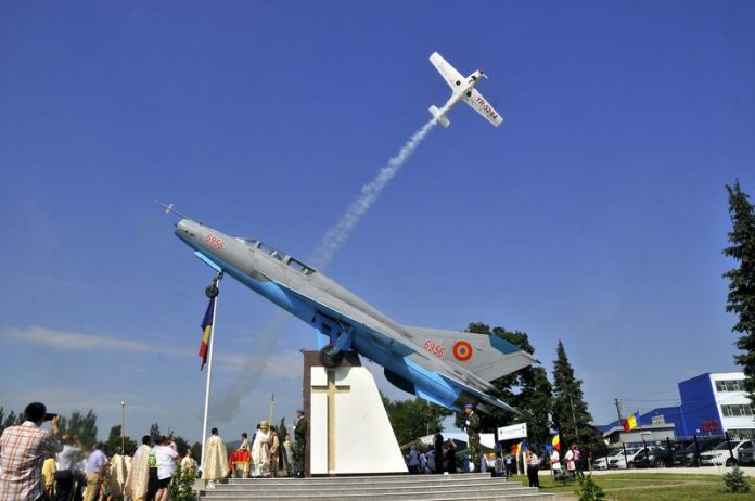 Fiind un lacas de rugaciune construit spre folosul aviatorilor bacauani, monumentul, format dintr-un avion MiG-21 incremenit pe soclu intr-un avânt catre infinit, reprezinta omagiul acestora pentru colegii lor mutati la Escadrila din Ceruri. IPS Ioachim si comandantul Bazei 95 Aeriene, cmdr. Valerica Vrajescu, au dezvelit placa memoriala de pe soclul monumentului in timp ce, pe cer, doua avioane ultra-usoare trasau cu traiectoriile lor, ca o rugaciune, salutul lor pentru colegii cazuti la datorie.