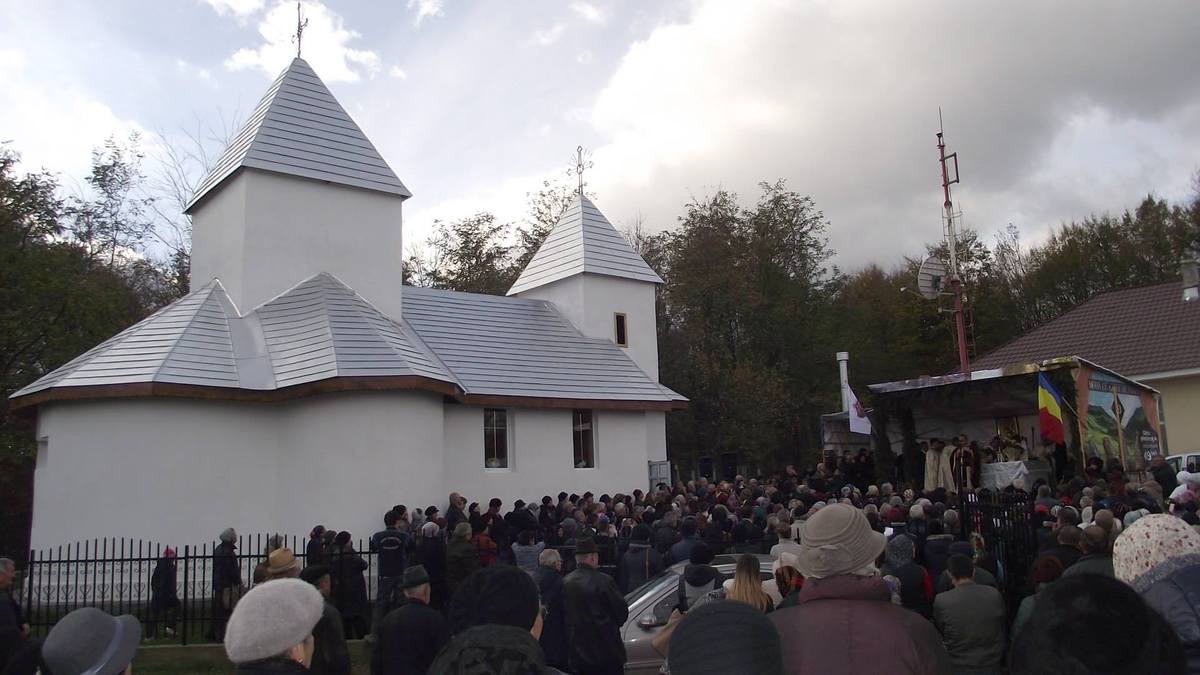 Ieri, Î.P.S. Ioachim Băcăuanul, protopopul Vasile Cozma, un impresionant sobor de preoți au oficiat slujba de sfințire a acestei biserici. Au sunat minunat, pentru întâia oară, în mijloc de codru secular, armoniile religioase. A fost foarte multă emoție. Cel mai emoționat a fost tânărul preot, ridicat în rang. Diplome pentru sponsori, vizită de excepție a enoriașilor în altar… Au participat și credincioși din alte zări. Autocare, pelerinaj, credință. Și toată suflarea cătunului, evident. Episcopia și Protopopiatul au asigurat vreo cinci sute de pachete pentru participanți. O biserică zidită din suflet.