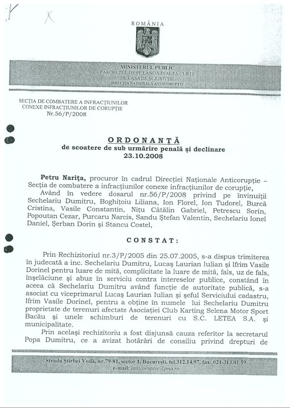 In presa locala au aparut informatii cu privire la o plângere formulata de Primaria Bacau la DNA ce are ca obiect vânzarea spatiilor comerciale catre Asociatia FCM Bacau in 2003. Printr-o ordonanta semnata de procurorul Cornelia Hrincescu, din 19 decembrie 2012 se arata ca DNA – Serviciul Teritorial Bacau – „nu este competenta sa efectueze urmarirea penala in cauza, nefiind intrunite niciunul din criteriile enumerate”. In plus, institutia isi declina competenta de solutionare a cauzei. Mai mult, se mai arata in document, paguba invocata de Primaria Bacau, zece milioane de euro, „nu poate fi primita”, iar municipalitatea trebuie sa dovedeasca in acte cum s-a ajuns la aceasta suma. Documentul confirma ordonanta de scoatere de sub urmarire penala si declinare din 2008, când tot DNA arata ca „in legatura cu modalitatea de vânzare-cumparare a spatiilor comerciale din pietele din municipiul Bacau si retrocedarea unor imobile nu s-au constatat fapte de coruptie ori asimilate lor” in care sunt acuzate mai multe persoane alaturi de Dumitru Sechelariu.