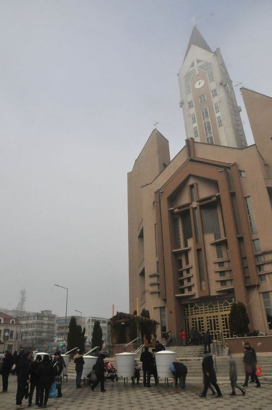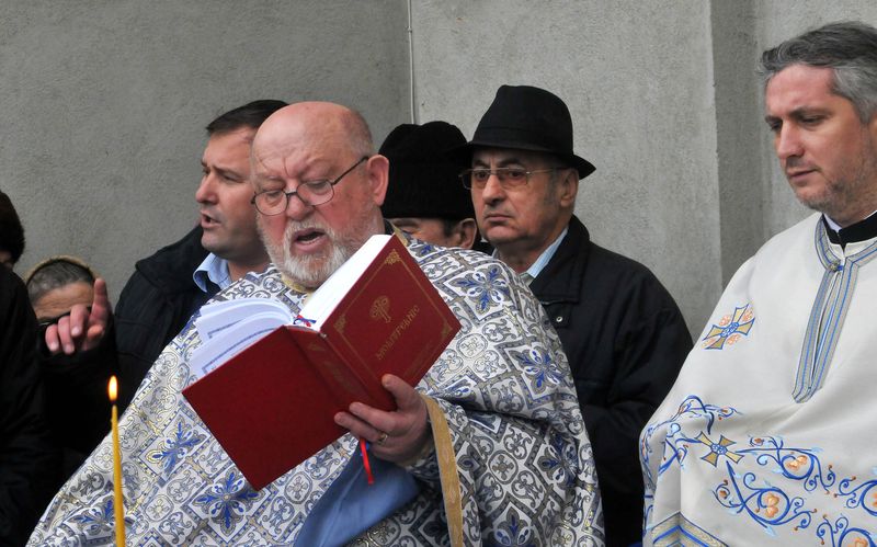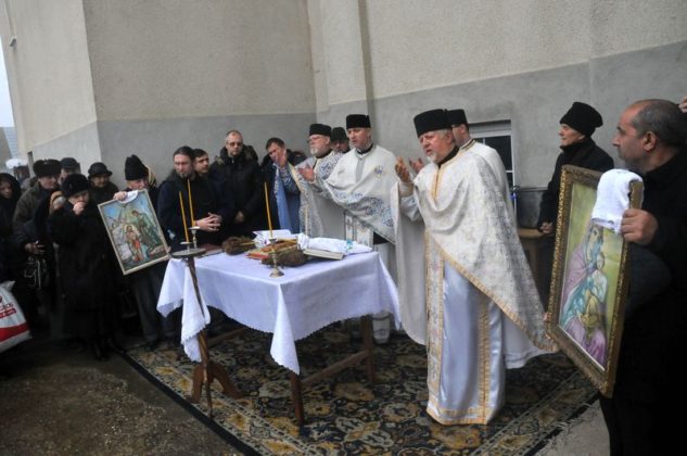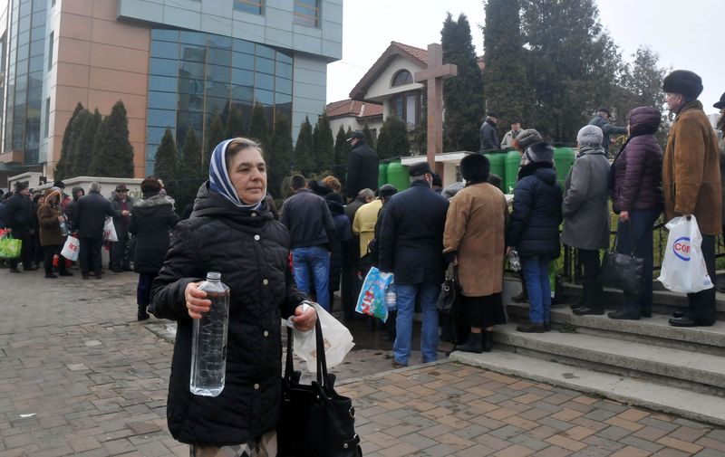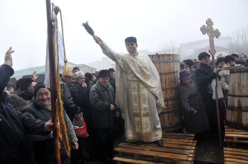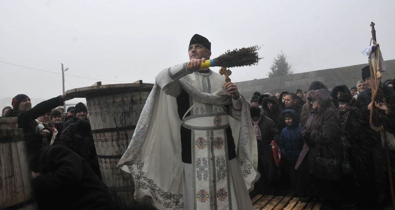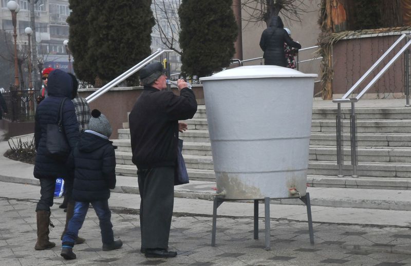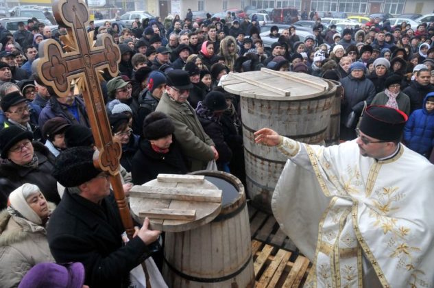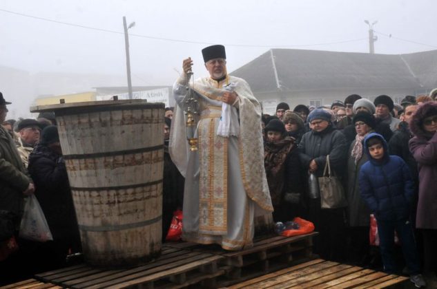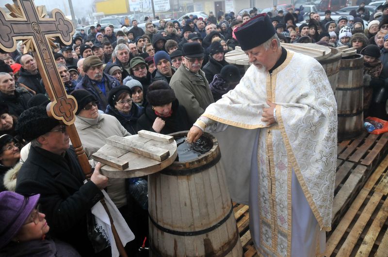 Printre fuioarele de ceaţă care au acoperit oraşul, credincioşii au înconjurat butoaiele cu apă limpede, ascultând rugăciunile pe care preoţii le intonau invocând Duhul Sfânt.
