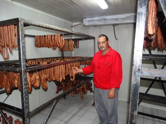 Aflăm din start că „Purcelușul vesel” din Negoiești-Ștefan cel Mare e brand local. „Nu producem cât se cere”, ne asigură Nicolae Giaboc, care răspunde de tot ce se întâmplă în carmangerie. Pornim pe drumul de la materia primă la bunătățile brun-roșiatice din final: șunculiță, cârnați, salam uscat, pastramă, costiță afumată.