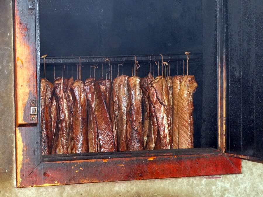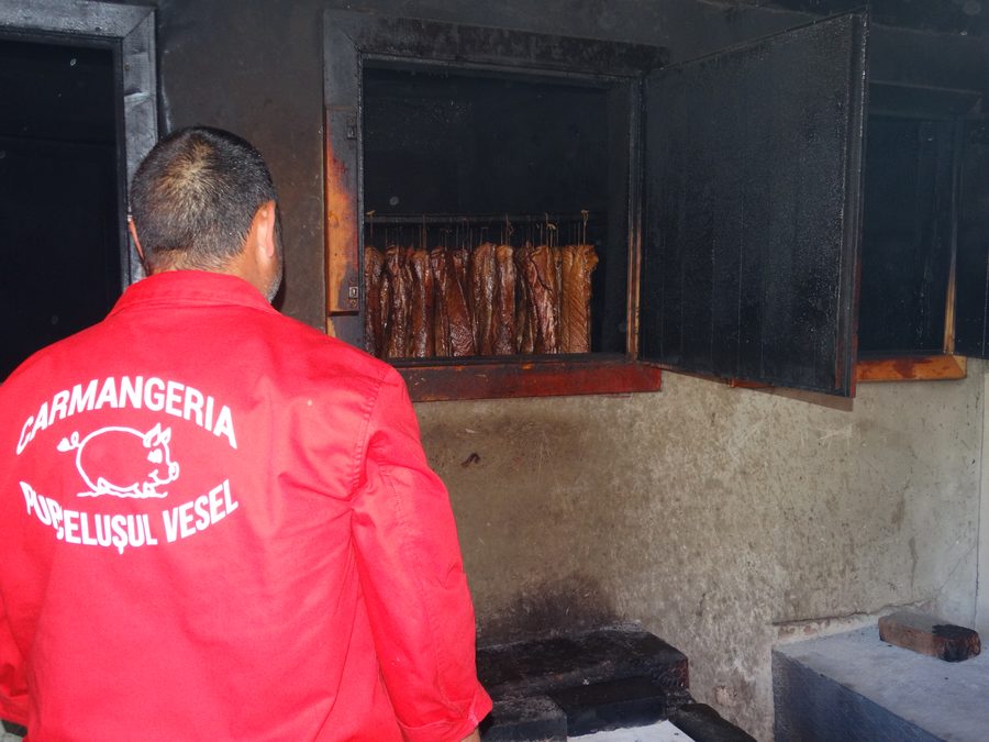Trecem printr-o încăpere în care înghețăm pe loc, când afară sunt 33 de grade, dar e firesc aici fiind atârnate carcasele, apoi cunoaștem o doamnă care, concentrată și răbdătoare, curăță usturoiul, vedem cum sunt preparați cârnații și pastrama, ne sunt deschise niște uși de metal dincolo de care se află preparatele atârnate la afumat, apoi descoperim și cuptorul plin de jar, din care urcă fumul în acele compartimente speciale, destinate uscării.