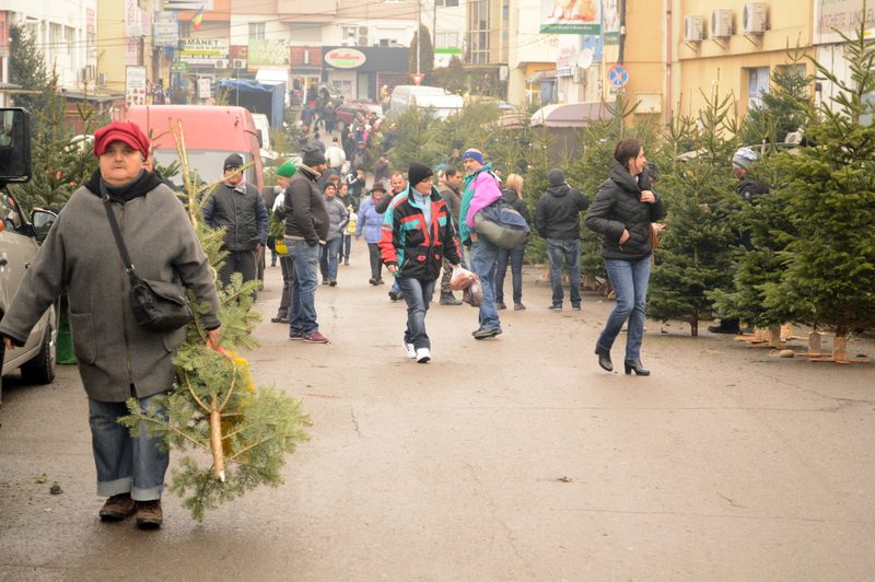 Poate o sa avem mai multi când vom intra cu adevarat in Europa si o sa sa ne dea si noua euroi”, glumeste pensionarul. In câteva minute, munteanul Costel vinde brazi ca pe banda rulanta, toti cu reducere 5-10 lei, ceea ce-i incânta pe clienti. „40 de lei si gata, am plecat. Vin nepotii si trebuie sa gaseasca ceva acolo, sub brad. Când eram eu tata, nu bunic, nu erau asa copiii, ca acum, cu tablete, telefoane de alea scumpe…”, marturiseste Gheorghe Adjudeanu, un alt pensionar. Altii se multumesc cu doar câteva crengute de 1-2 lei sau cu o impletitura de cetini, la 10-20 de lei bucata. Mai spre margine, un comerciant incerca sa vânda o duzina de brazi frumosi, cu tot cu radacina, asezati in vase cu pamânt. „180 de lei bucata, negociabil. Sunt adusi din Olanda. N-are lumea bani, asta e. Mai mult cumpara cei care stau la casa. Am dat vreo 3-4, de azi dimineata. E fain ca, dupa Sarbatori, brazii astia pot fi pusi in pamânt, ca sa creasca mai mari”, explica vânzatorul.