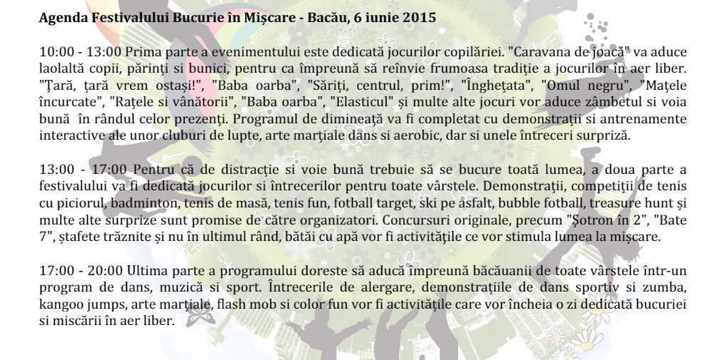 Motivul? Prima editie a festivalului „Bucurie in miscare” organizat de Asociatia „Creatori de viitor”, ce se va desfasura intre orele 10.00 si 21.00.