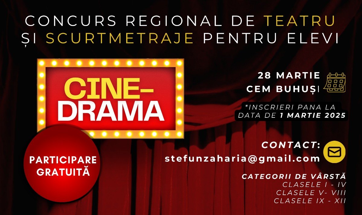 Cortina se ridică la Buhuși pentru o ediție record a Concursului Regional de Teatru și Scurtmetraj „CINE DRAMA”. Evenimentul va culmina sâmbătă, 28 martie, transformând orașul într-un hub creativ pentru tinerii artiști din întreaga țară, la doar o zi după celebrarea Zilei Mondiale a Teatrului.