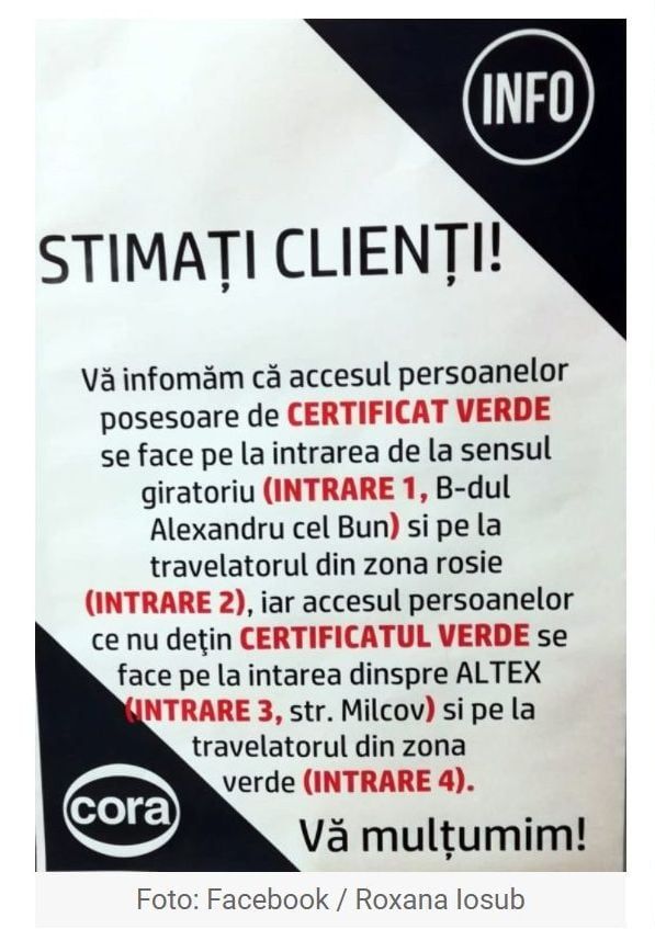 Cora, la rândul său, a inovat prin introducerea unor „coridoare” de acces pentru persoanele fără certificat verde. Acestea pot intra prin anumite puncte ale complexului comercial și, pe niște coridoare balizate cu frânghii, întră în supermarket, dar nu pot intra în celelalte spații comerciale.