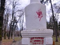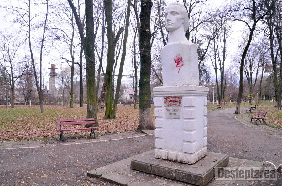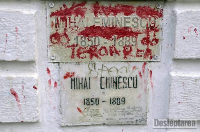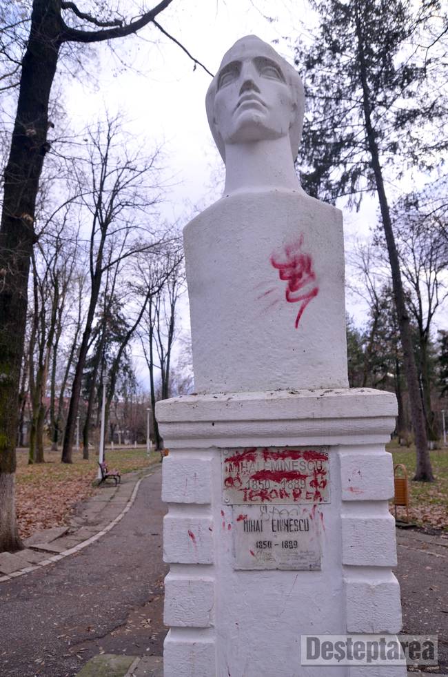 Soclul bustului lui Mihai Eminescu, amplasat pe o alee din Parcul Cancicov din Bacau, a fost vandalizat de persoane necunoscute, care au mazgalit cu rosu placa pe care este scris numele poetului.