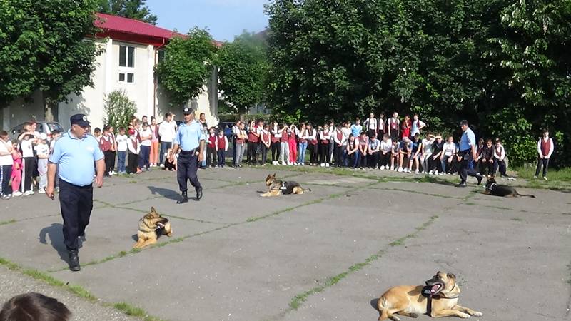 Programul a cuprins momente de dresaj general, dar s-a simulat si imbobilizarea unui tâlhar, toate miscarile fiind atent urmarite de elevi, care s-au declarat incântati de prestatia câinilor.