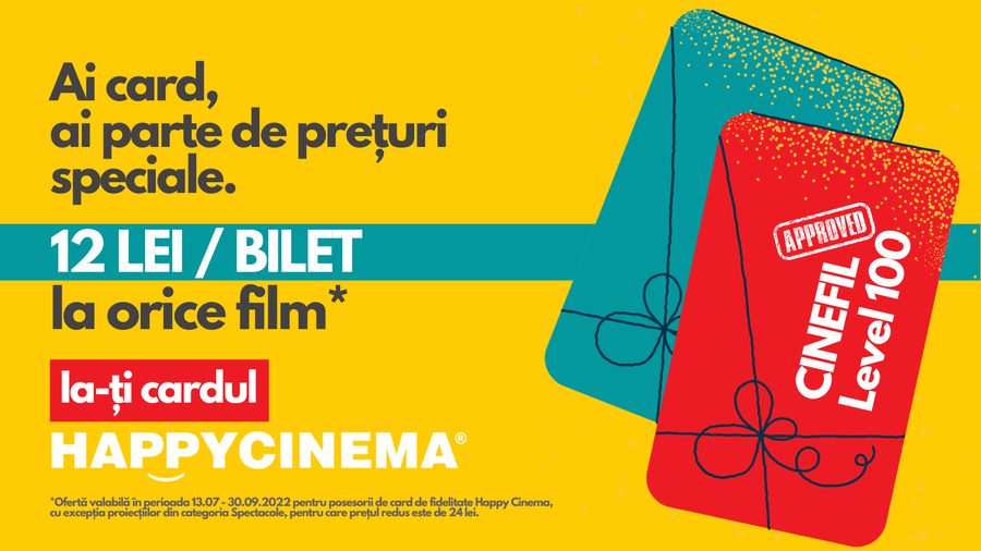 În perioada 13 iulie – 30 septembrie 2022, posesorii cardului de fidelitate Happy Cinema beneficiază de un preț special la orice film din program: 12 lei/bilet, cu excepția producțiilor din categoria Spectacole, pentru care prețul redus este de 24 de lei.