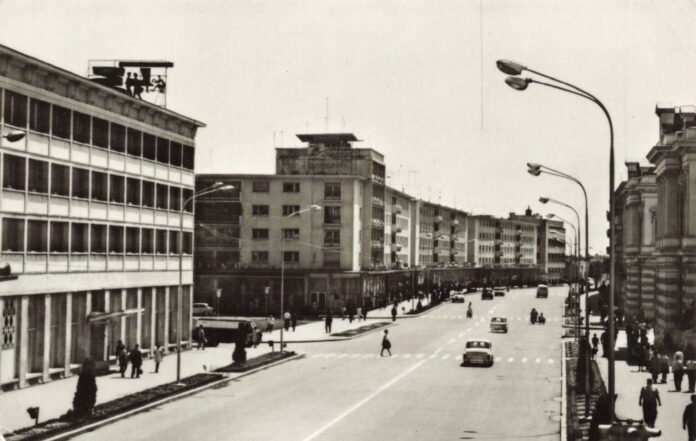 În partea dreaptă a imaginii, silueta unei clădiri cu arhitectură istorică – Palatul Administrativ – contrastează cu noile construcții moderniste. Acest detaliu oferă o perspectivă interesantă asupra modului în care trecutul și prezentul coexistau în aceeași perioadă.